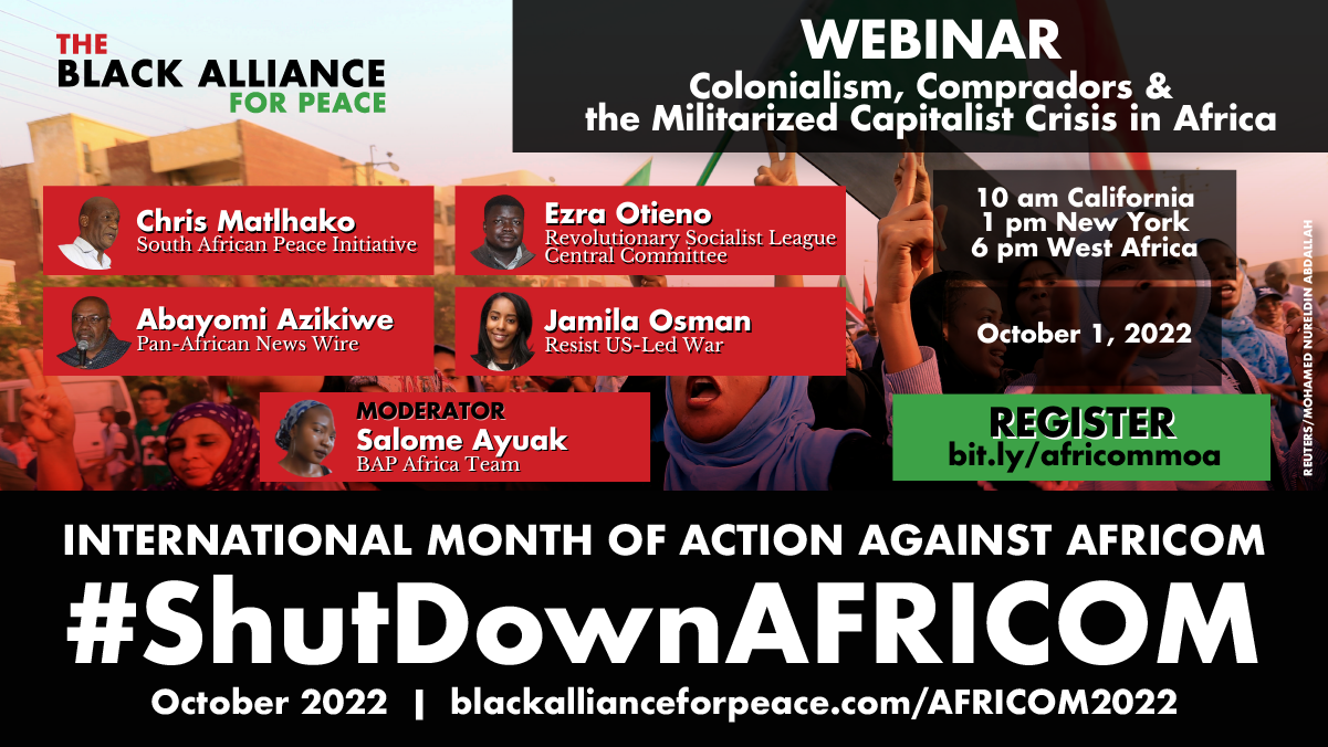 The Black Alliance for Peace (BAP) has taken up the task of educating the public on AFRICOM and the extensive basing networks in Africa and throughout the world. Our campaign on AFRICOM is an integral element of our general opposition to U.S. global militarization, with its offensive command structures, approximately 800 to 1,000 overseas bases, and the United States' status as the number one arms merchant on the planet.