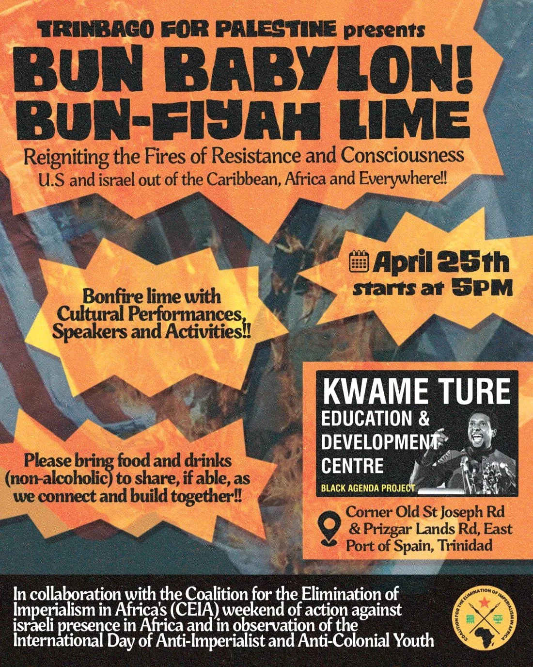 Trinbago for Palestine hopes to reignite the fires of consciousness and resistance among the people of T&T through a community bonfire at the Kwame Ture Centre on Saturday, 25 April 2026, calling for the end of US and israeli presence in the Caribbean and Africa. This event is especially geared towards the youth and anyone unfamiliar with our revolutionary history, and the movements towards freedom and dignity for and by enslaved people and their descendants.