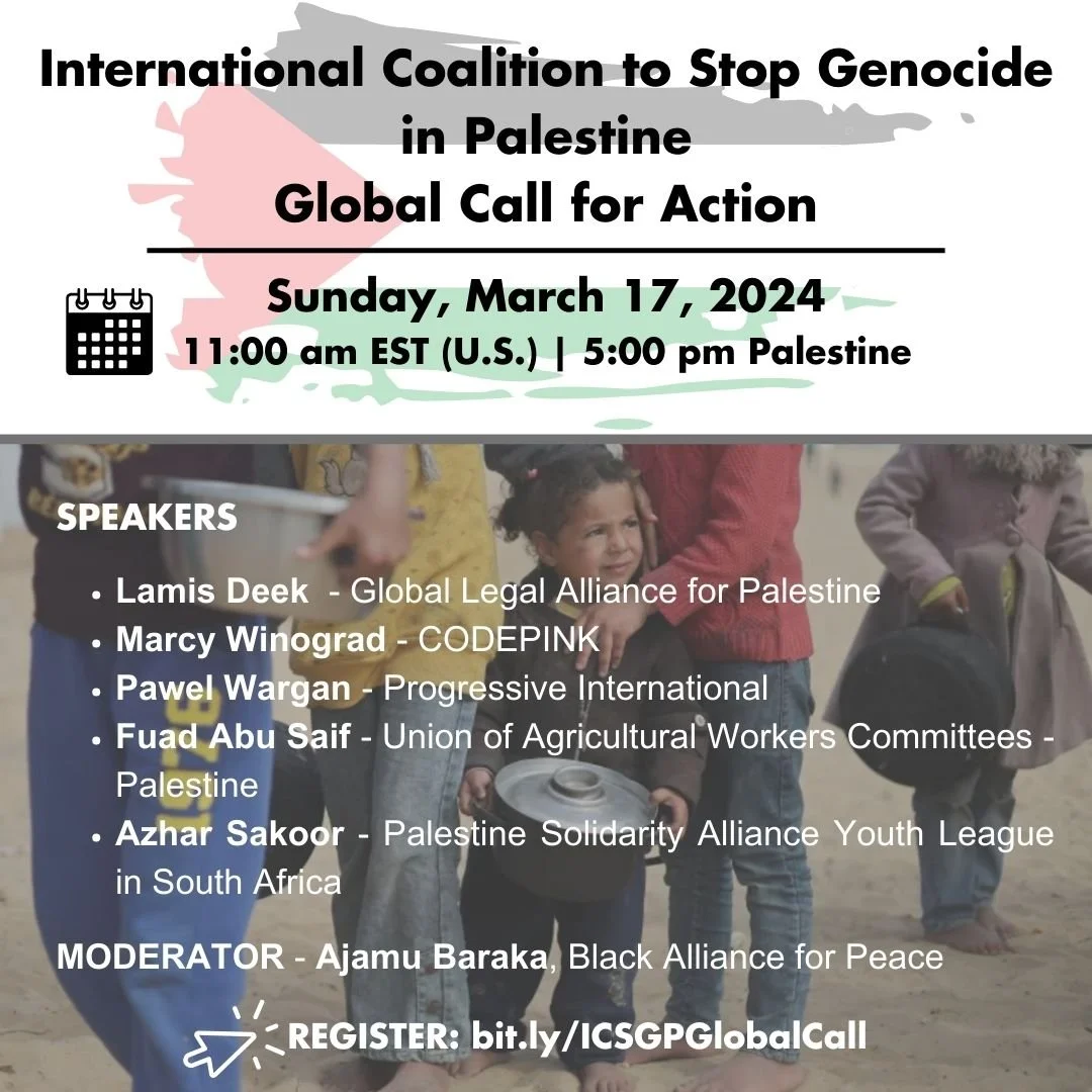 The International Coalition to Stop Genocide in Palestine invites all endorsing organizations to join a global call on Sunday March 17 at 11:00 am Eastern to share ways that groups are working to build public support for an end to Israel's genocidal acts, provide humanitarian aid to Palestinians and amplify the global anti-colonial, anti-imperial movement.