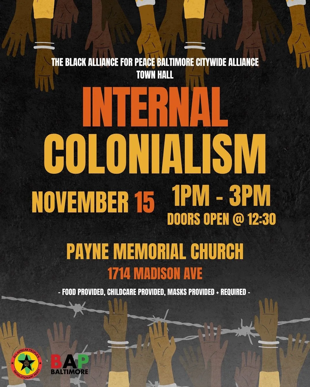 BAP Baltimore’s Citywide Alliance is holding an event focused on Internal Colonialism. A teach-in on mass incarceration, industrialization complex, and more on the ways in which the powers that be exploit disenfranchised folk from within.