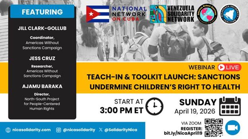 Americas Without Sanctions will present its new teach-in materials to explain how the US blockades of Cuba and Venezuela undermine children’s right to health.” As we demand that the US Government Stop Killing Children with Sanctions, we also call for a Peoples-Centered Human Rights framework.