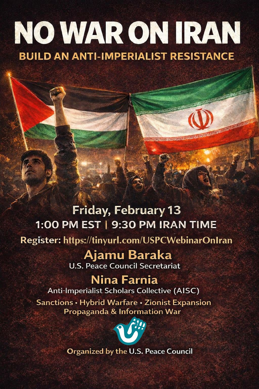 Join the US Peace Council for this urgent discussion featuring Ajamu Baraka (USPC Secretariat) and Nina Farnia (Anti-Imperialist Scholards Collective). This webinar will examine sanctions, hybrid warfare, Zionist expansion, and the role of propaganda and information warfare in manufacturing consent for imperialist intervention. Grounded in historical and material analysis, the conversation will situate the current crisis within the long arc of U.S. imperialism, regime-change operations, and resource control in Western Asia. What are the stakes for Palestinian liberation, Iranian sovereignty, and global multipolarity? And how can movements in the imperialist core build principled resistance to sanctions, militarism, and imperialist war? Join us and be part of building an internationalist front against war.